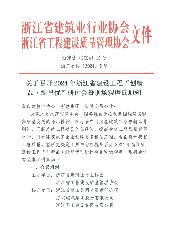 关于召开2024年浙江省建设工程“创精品•浙里优”研讨会暨现场观摩的通知